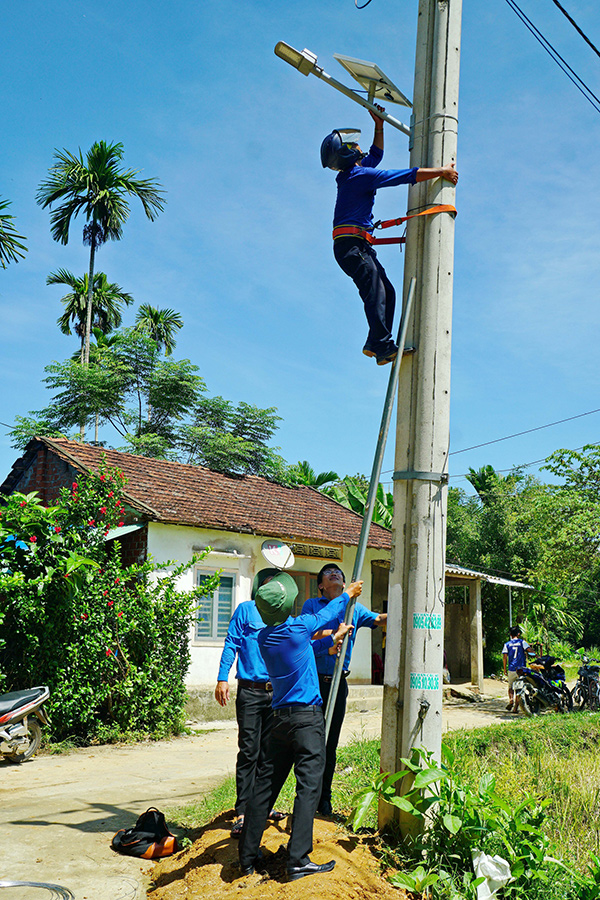 Đoàn viên thanh niên huyện Tiên Phước tham gia lắp đặt điện chiếu sáng tại thôn Thanh Bôi (xã Tiên Châu). Ảnh: NGUYỄN ĐIỆN NGỌC