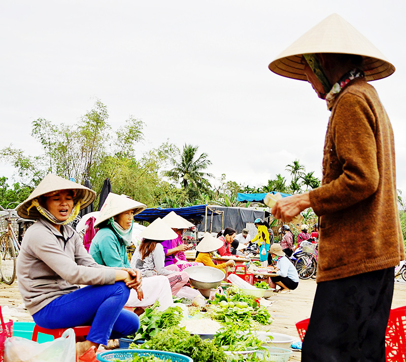 Chỉ là góc chợ thôi, nhưng đủ đầy mọi thứ. Nhất là những thứ rặt quê. Không gọi tên là quê sao được, khi mà các bà, các mẹ mỗi người một rổ rau hái trong vườn nhà, vài trái khổ qua, vài trái mướp, vài bó đậu đũa..., có khi lại là mớ ớt sim chín mọng bỏ trong những bao nhỏ. Mùa nào rau củ nấy. Thơ thẩn dọc chợ quê, tôi như thấy bức tranh xưa thật là xưa trong mấy câu ca dân gian tái hiện rõ mồn một: “…tháng hai trồng đậu, trồng khoai, trồng cà/ tháng ba thì đậu đã già/ ta đi ta hái về nhà phơi khô…”, hay như “chiêm xong lại đến vụ mùa/ hết mùa rau muống đến mùa cải hoa/ đừng khinh dưa muối, tương cà/ tuy rằng ít bổ, nhưng mà có luôn”…