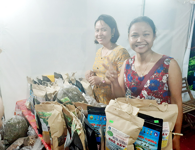 Hồ Thị Mười (bên trái) cùng các sản phẩm dược liệu của cơ sở sản xuất Mười Cường.